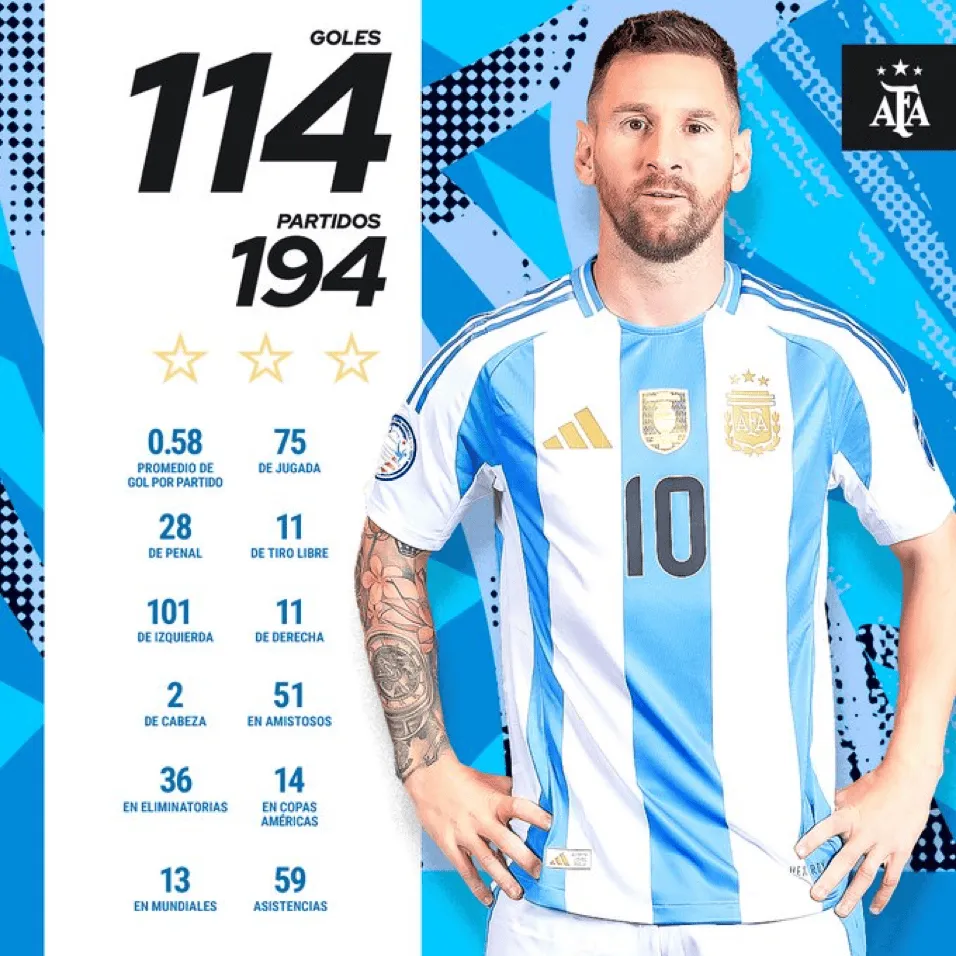 阿根廷官方发布海报,回顾了梅西国家队生涯所创造的进球数据: