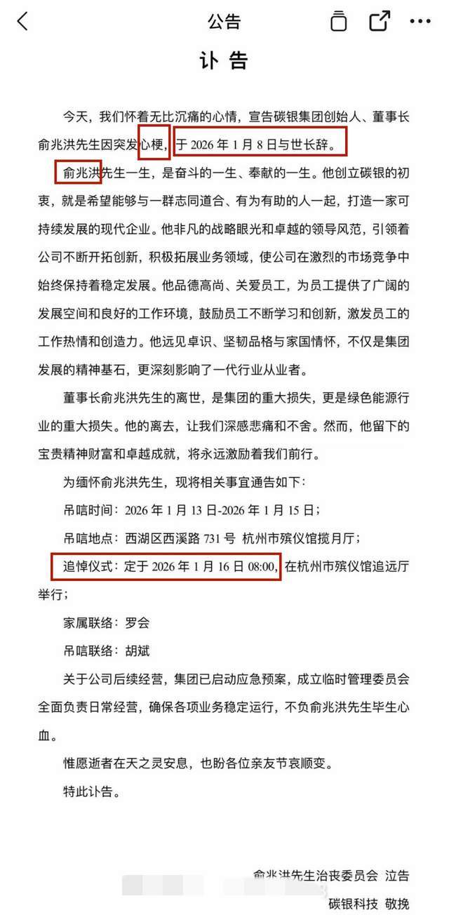 随后,有知情人士晒出“碳银集团”治丧委员会的公告,由此更加证实了这一噩耗。