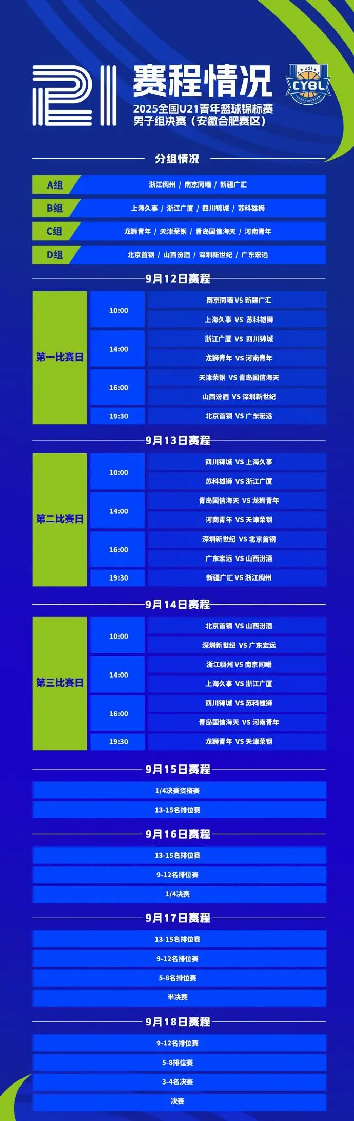 虎扑09月10日讯 据全国青少年U系列篮球联赛官方消息,2025年全国U21青年篮球锦标赛男子组决赛(安徽合肥赛区)赛程公布。